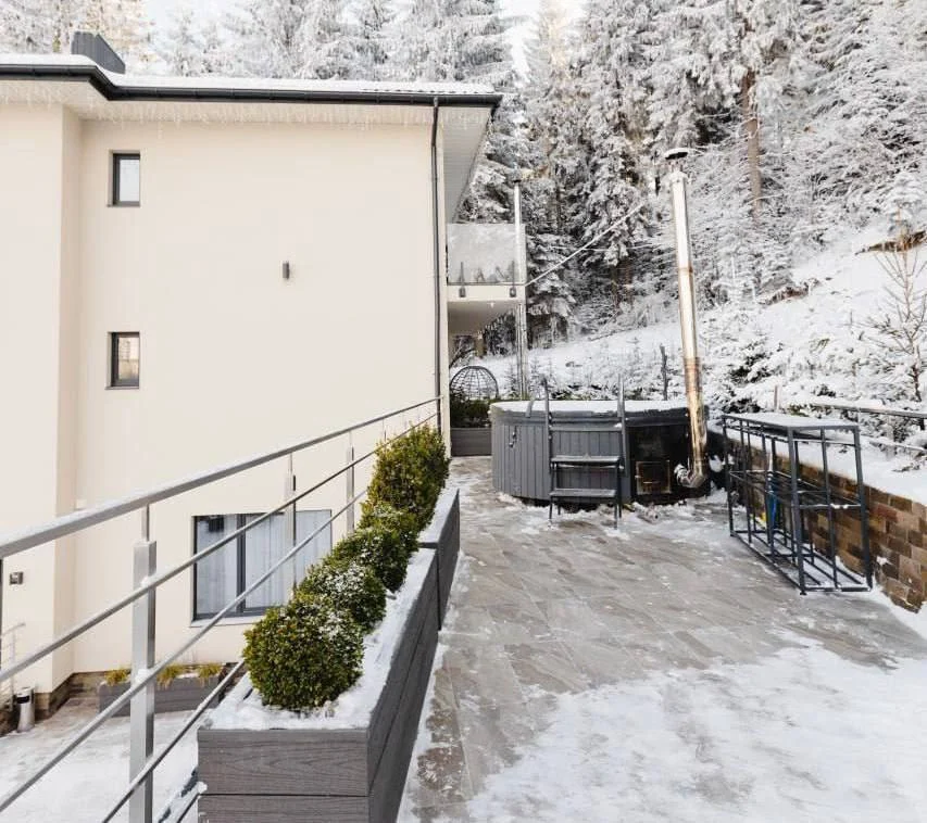 Складається із 4 спалень із окремими санвузлами, вітальні, кухні, лижної кімнати та тераси, гриль-зони, джакузі
